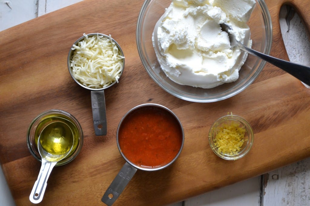 In a small bowl, mix together ricotta, ¼ cup shredded mozzarella, 1 tablespoon of olive oil, lemon zest, salt, and pepper until combined.