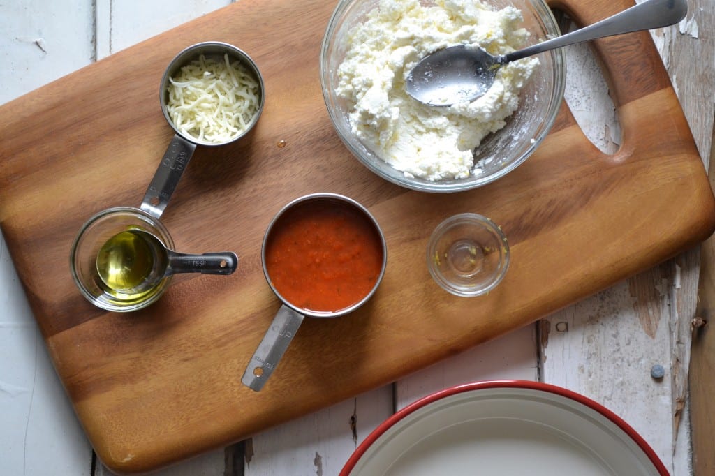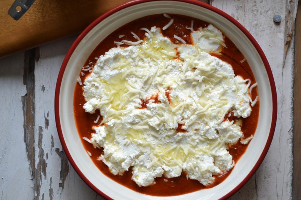 Add the marinara to the bottom of a pie pan or a 10 ½ inch round baking dish. Spread the marinara out in an even layer. Dollop the ricotta mixture on top of the marinara. Spread the ricotta out as evenly as you can leaving a 1 inch border of sauce around the edge.