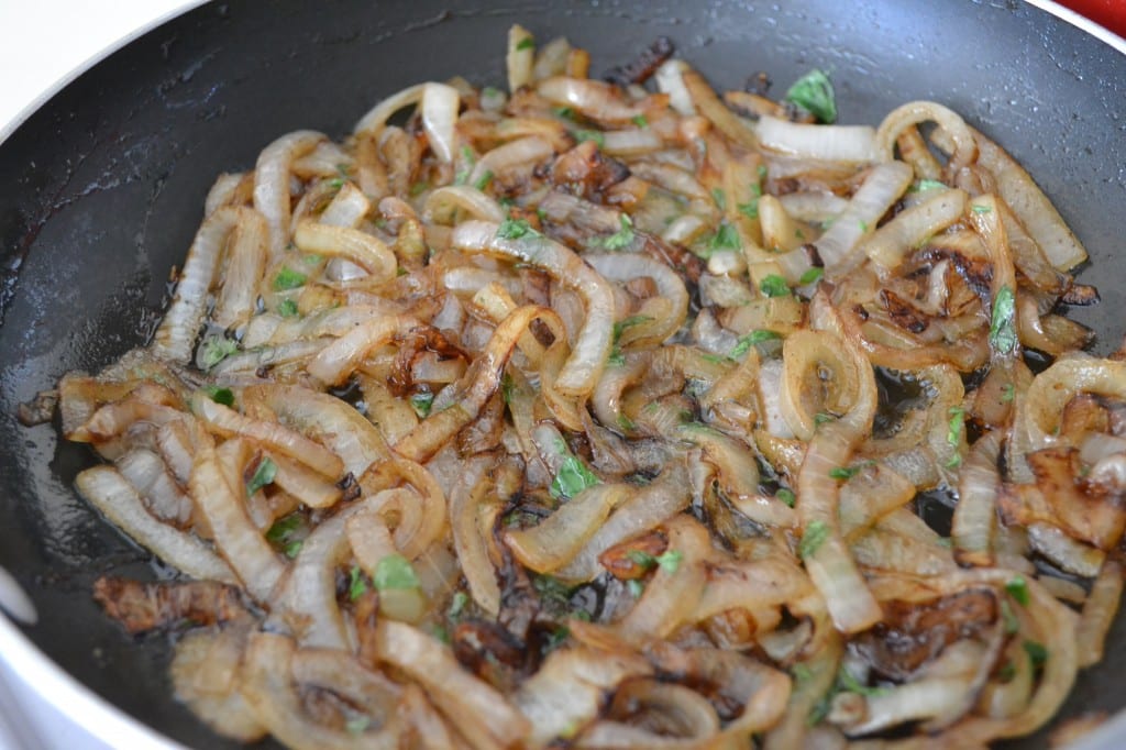 Add butter and olive oil to a large skillet, heat for a minute over medium/high heat until the butter melts. Add the onions. Stir and cook the onions until they become translucent and slightly browned on the edges, about seven minutes. Add the balsamic vinegar, salt, and pepper. Sautee onions until deeply caramelized, about another ten to twelve minutes. Once caramelized, add chopped basil and turn off heat.