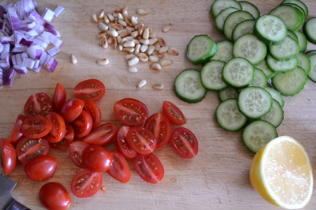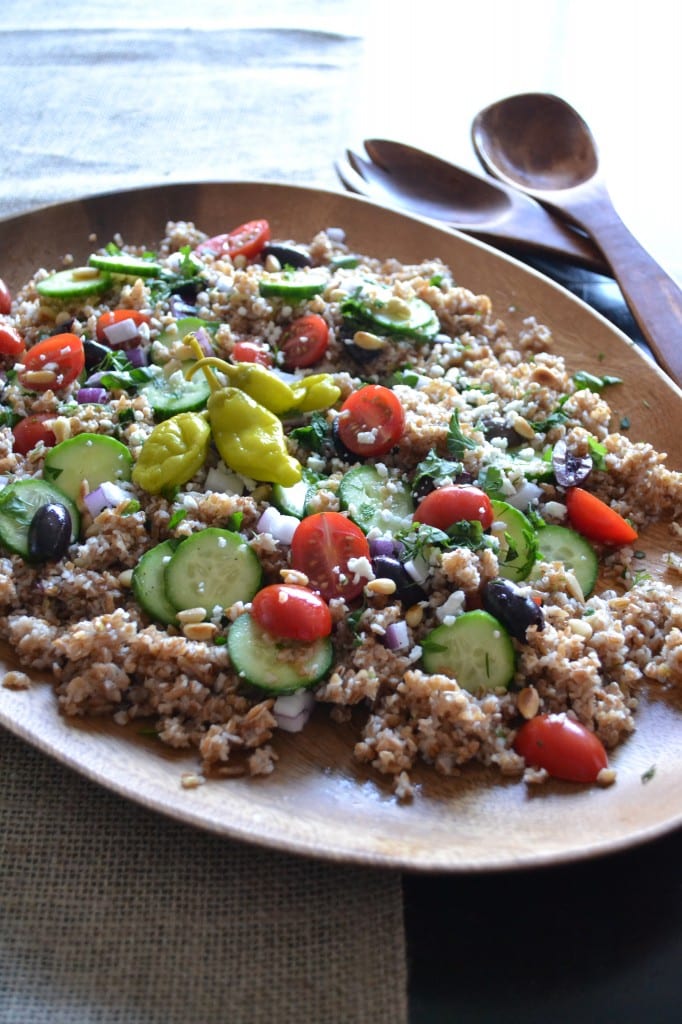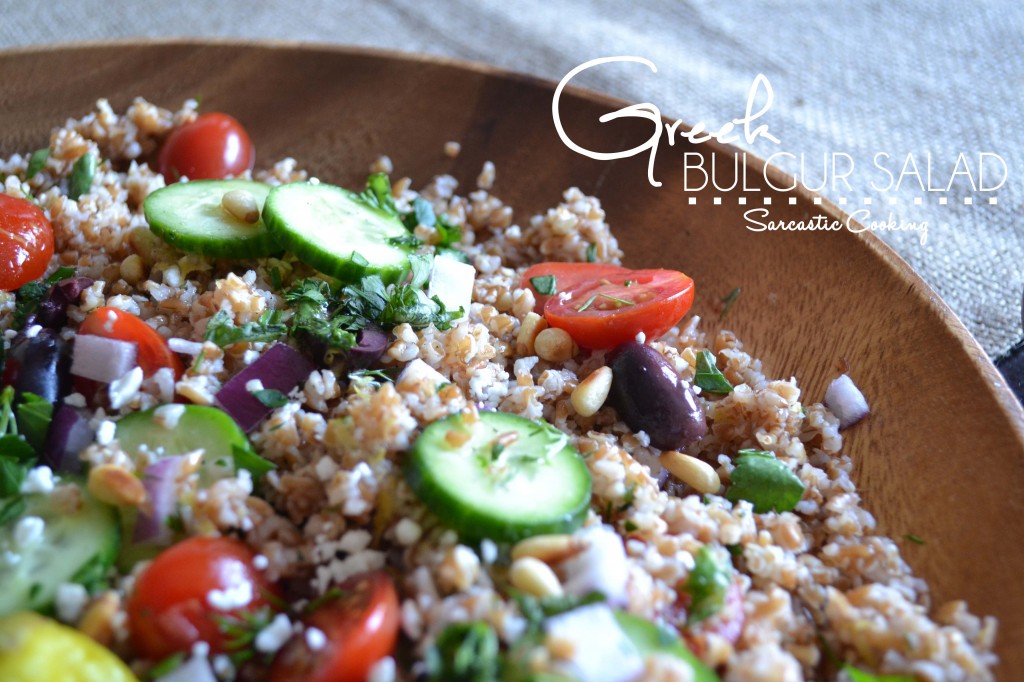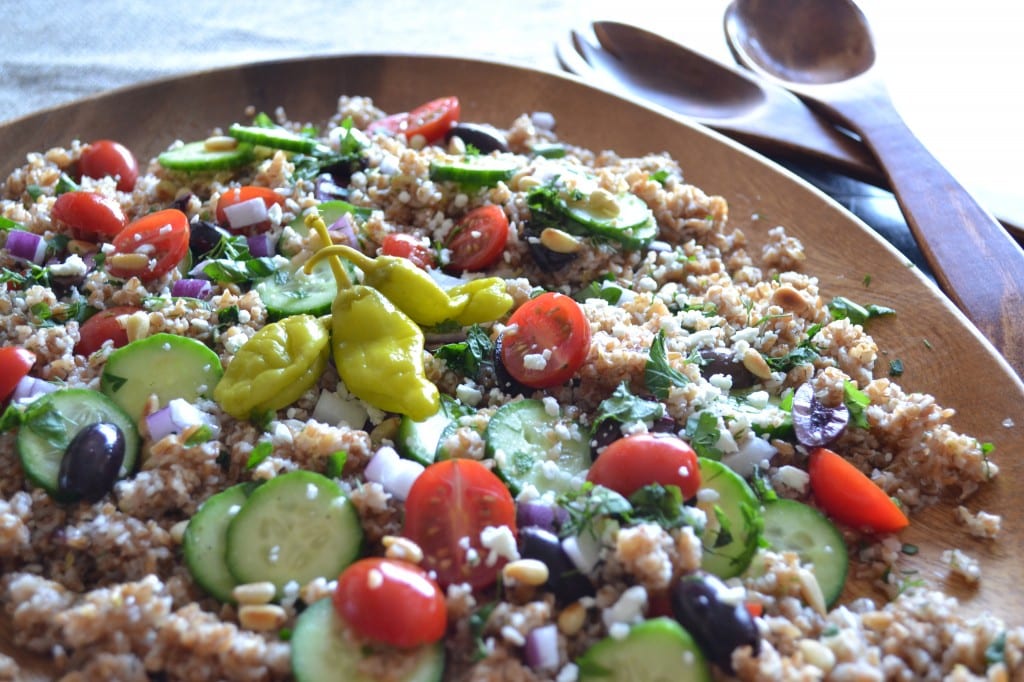 When the bulgur is cooled, add to a large mixing bowl along with cucumber, tomatoes, red onion, kalamata olives, pine nuts, feta, and herbs. Mix well.