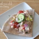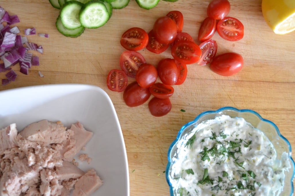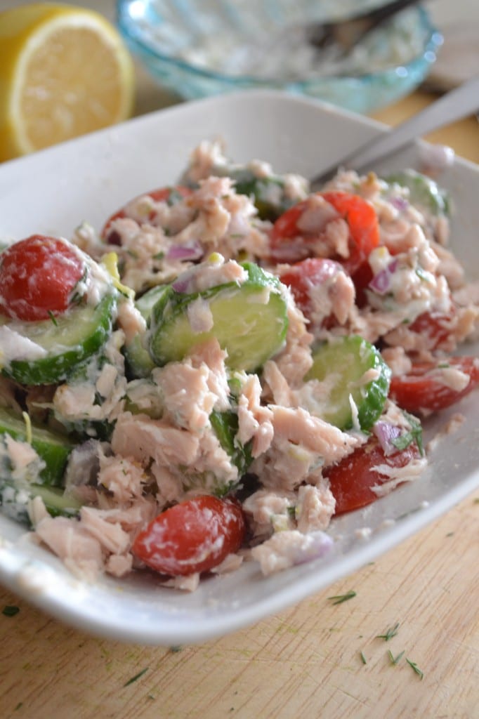 Light tzatziki tuna salad is the perfect, light, and easy way to use up some garden veggies and eat lunch at the same time. Greek yogurt, lemon juice, and olive oil make the base of this tuna salad. Serve it with pita bread or on a whole grain bread.