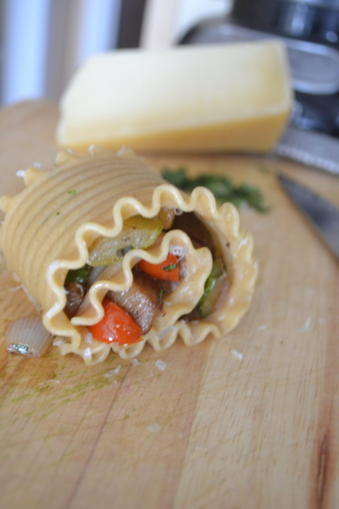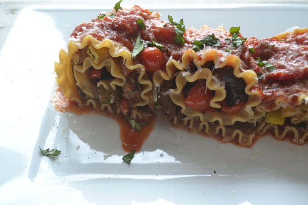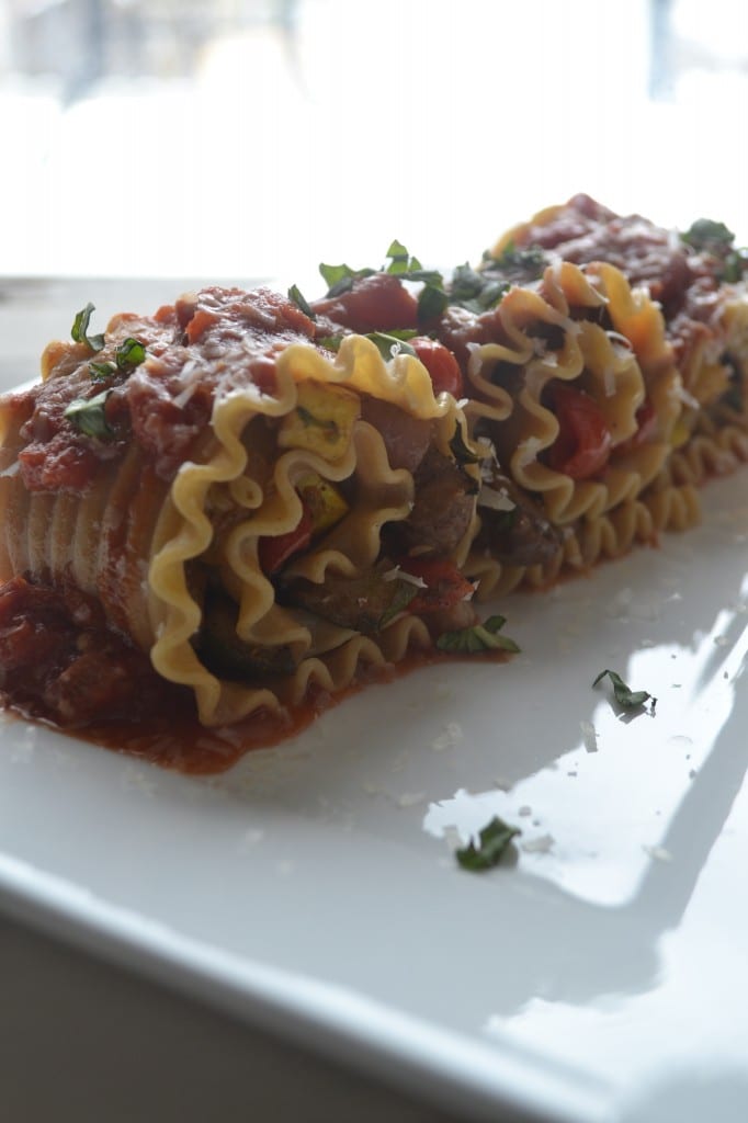 Lay a cooked lasagna noodle out flat. Place a few spoonfuls of the cooked vegetables on to the noodle. Carefully roll the noodle up. If a few vegetables fall out, don’t worry. Place rolled up noodle, seam side down, into a small oven-safe dish with a little bit of marinara in the bottom of it. Continue that process until all noodles are filled and rolled up.