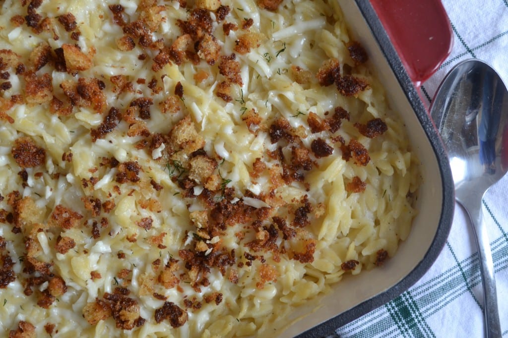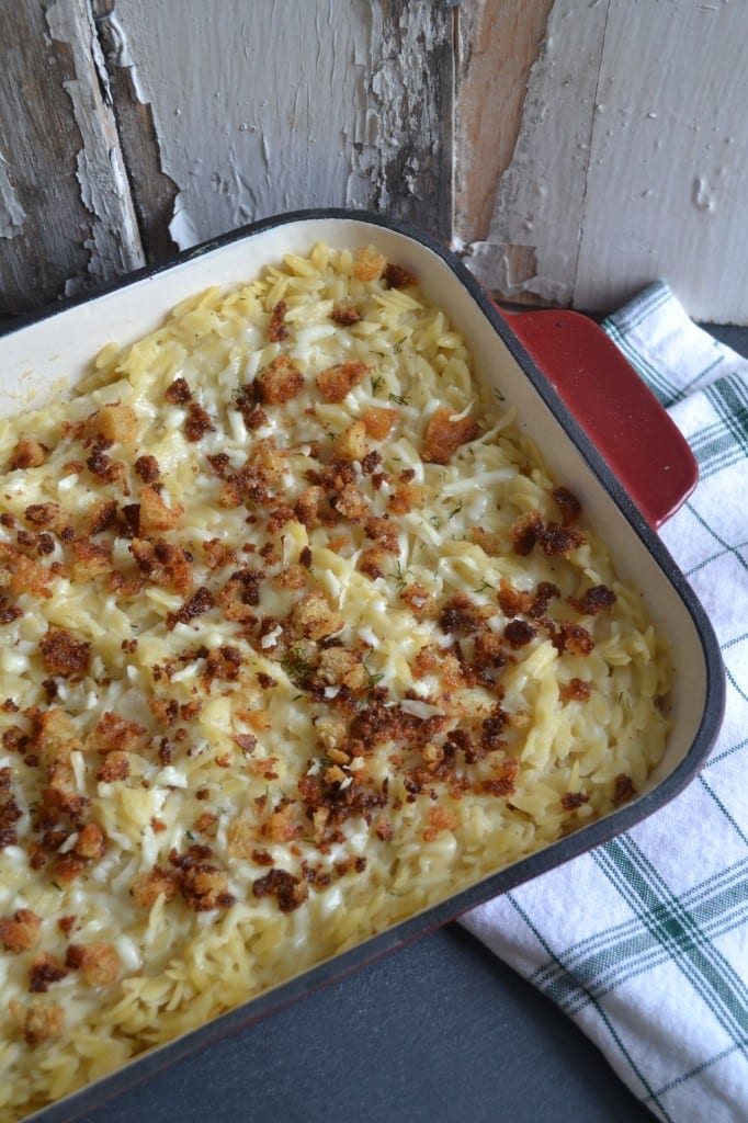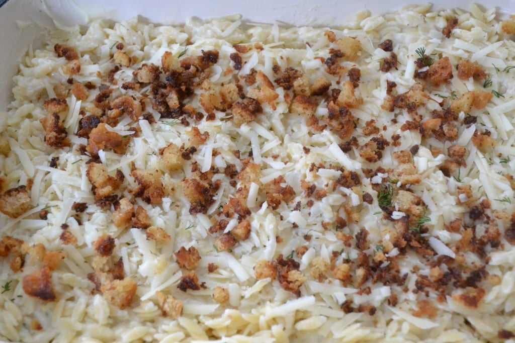 Pour the brown butter breadcrumbs over the cheesy orzo along with a little bit more shredded asiago and parmesan cheese.