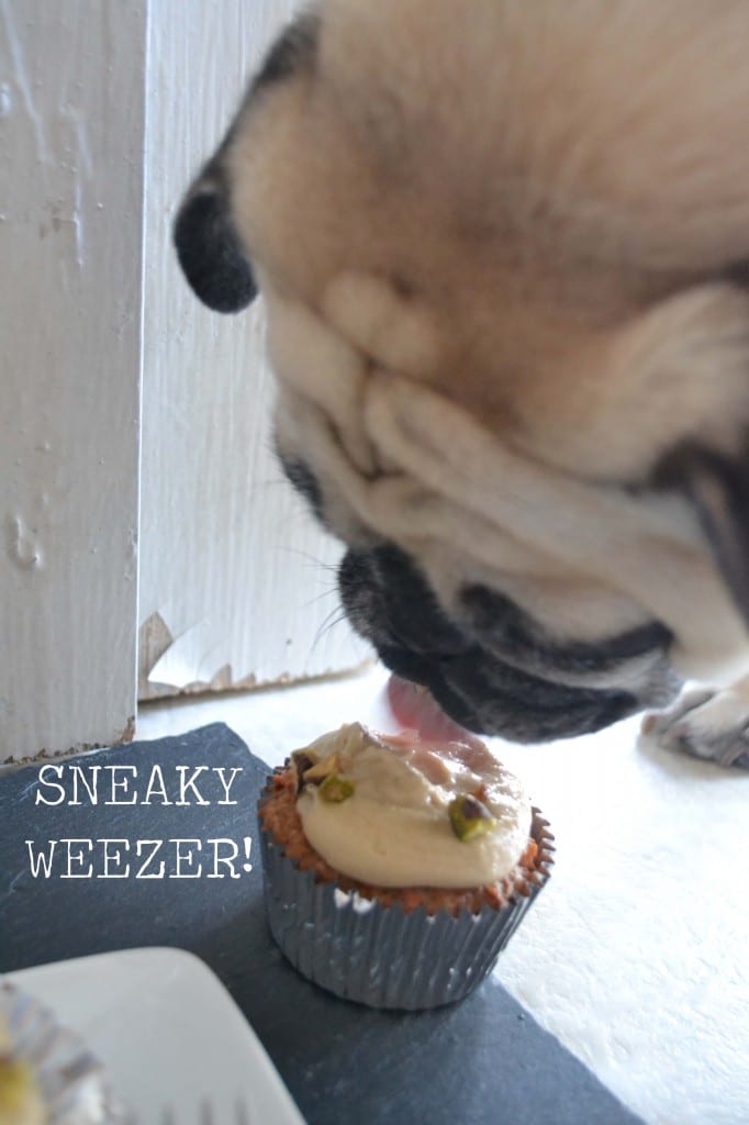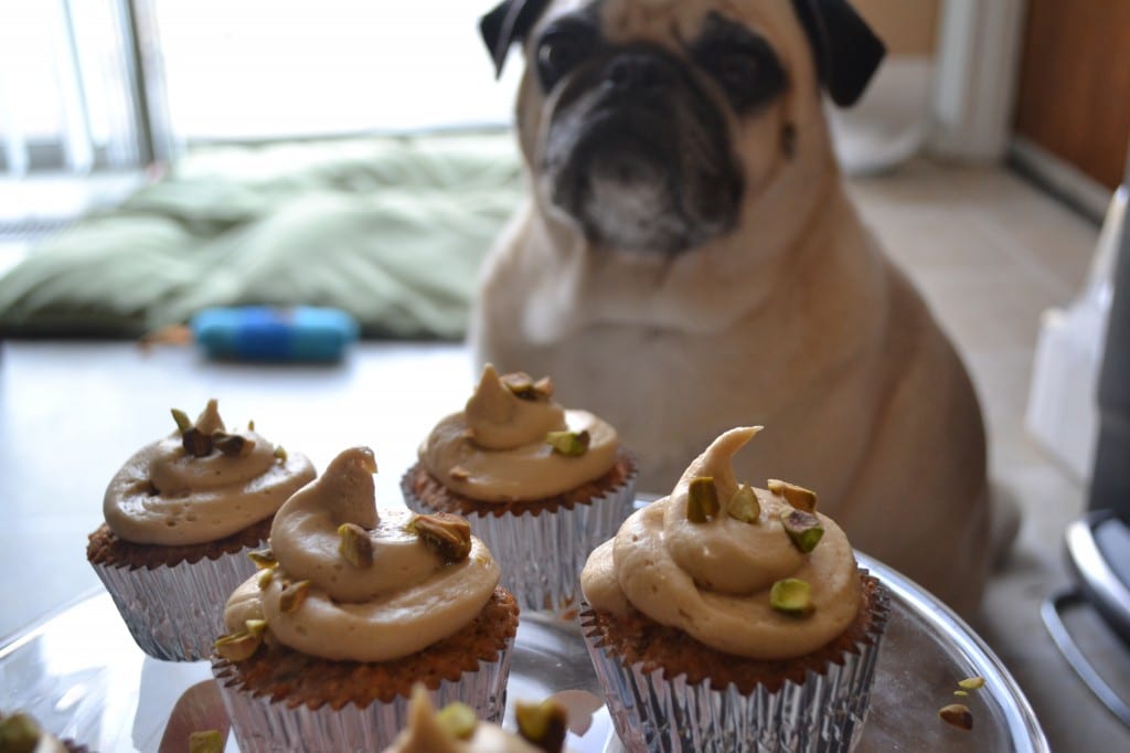 I like baking early in the morning. Then the house smells lovely all day. If I am blogging the recipe, I bake, take pictures, and finish up some work. Sometimes, a little sneaky pug appears and steals a bit of frosting, which may or may not throw off my work day.