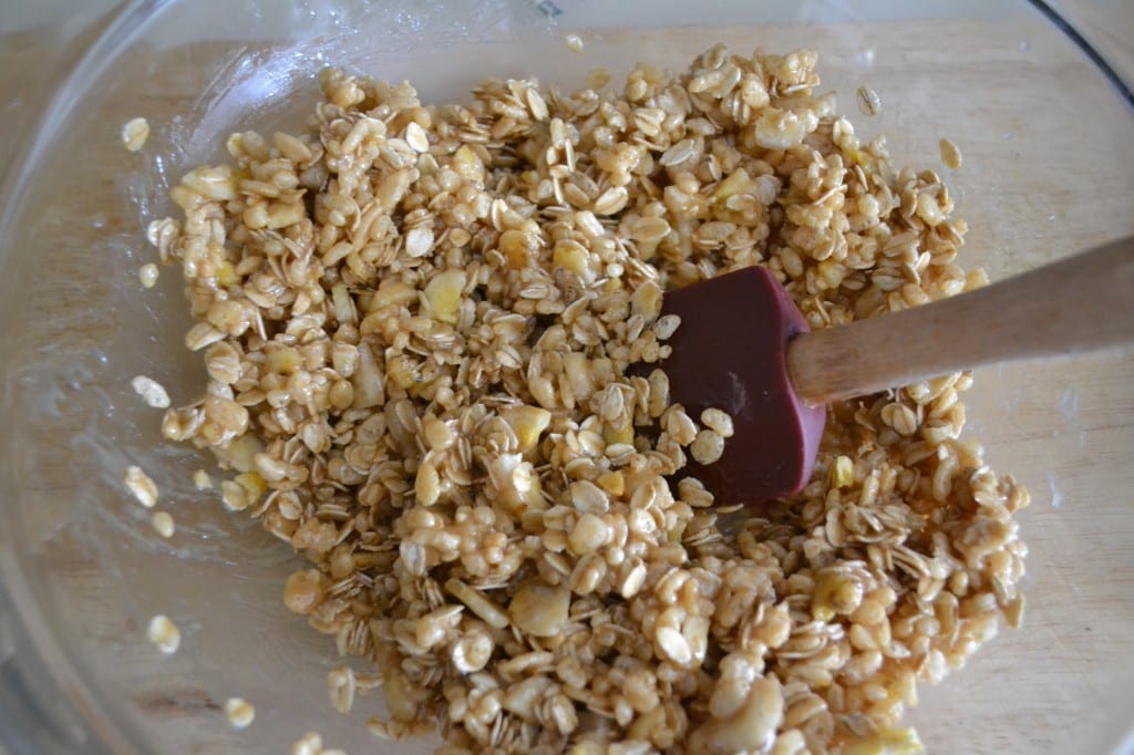 Add crisped rice cereal, oats, and crushed banana chips to a medium mixing bowl. Pour melted mixture into the bowl and mix together.