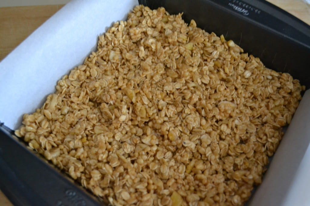 Add mixture into an 8x8x2 inch or 9x9x2 inch parchment lined baking dish. Use a rubber spatula or spoon to make sure the granola is in one even layer. Place dish in the refrigerator for at least 30 minutes to allow the bars to harden.