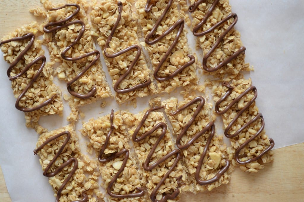 Add Nutella to a small microwave-safe bowl. Heat in the microwave for thirty seconds, just to loosen the Nutella up a bit. Add Nutella to a small sealable plastic sandwich bag. Snip a small hole in one of the corners of the bag. Pipe the Nutella on to the bars. Let sit another 5 minutes to set up before eating.