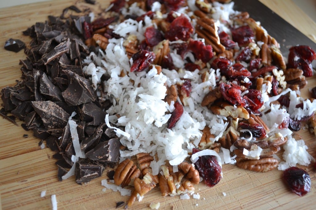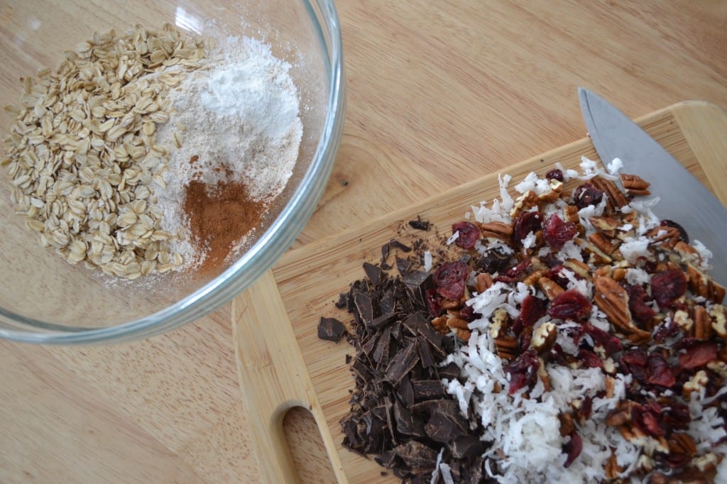 In a medium/large mixing bowl, whisk together the flour, oats, baking powder, salt and cinnamon. Stir in flax seeds and 1/2 cup shredded coconut, then mix in the dried fruit, pecans and dark chocolate.