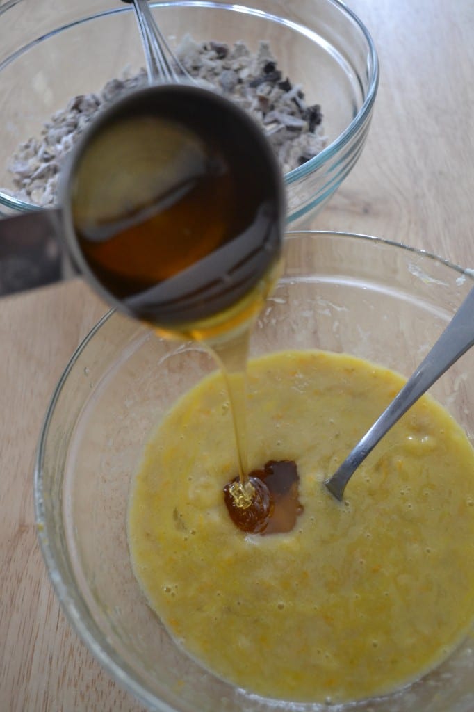 In a separate, medium mixing bowl, whisk together the coconut oil, orange zest, mashed banana, honey, egg and vanilla. If the coconut oil seizes up when mixed with the other ingredients, microwave for a few seconds until it melts again.