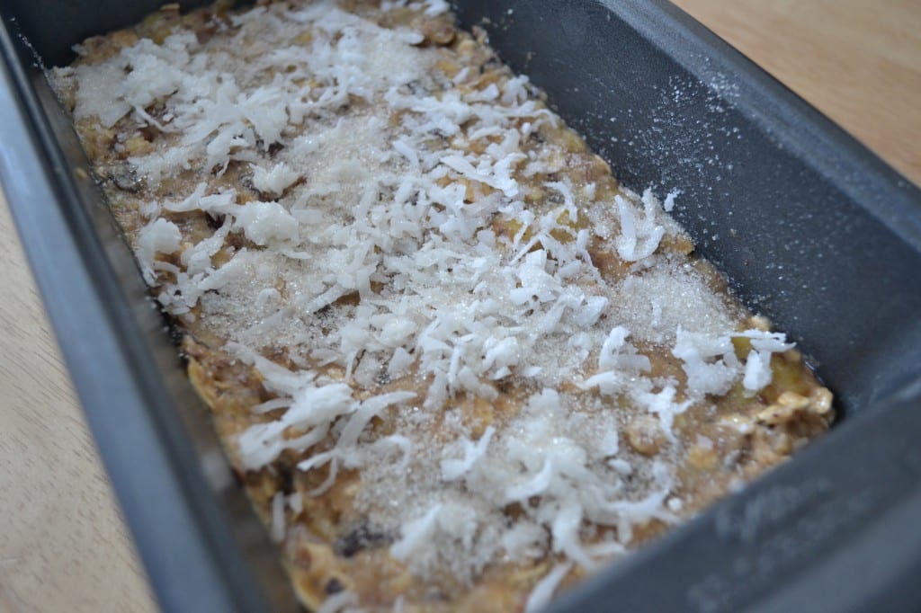 Pour the wet ingredients into the dry ingredients and stir using a rubber spatula or wooden spoon until just combined. Pour the batter into loaf pan and sprinkle the top with the remaining 1/4 cup coconut and sugar.