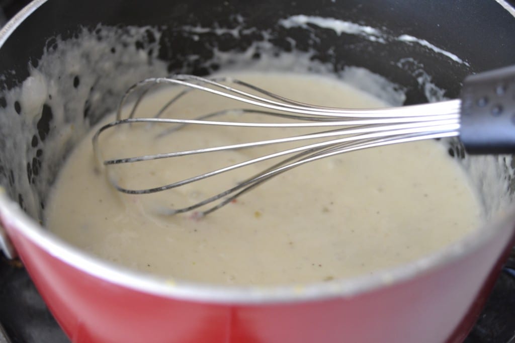 To make the cheese sauce, melt the butter over medium heat in a small saucepan. Whisk in the flour, cook one minute. Whisk in the milk and then the cheese. Continue to whisk until the cheese has melted and the sauce comes together. Add salt and pepper to taste. Leave on the stove over low until you are ready to assemble the pizza.
