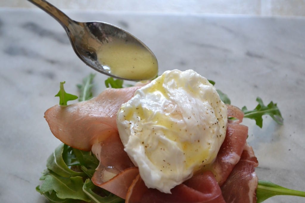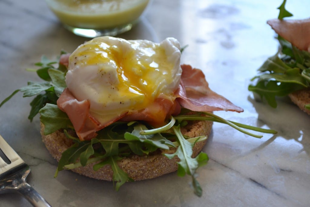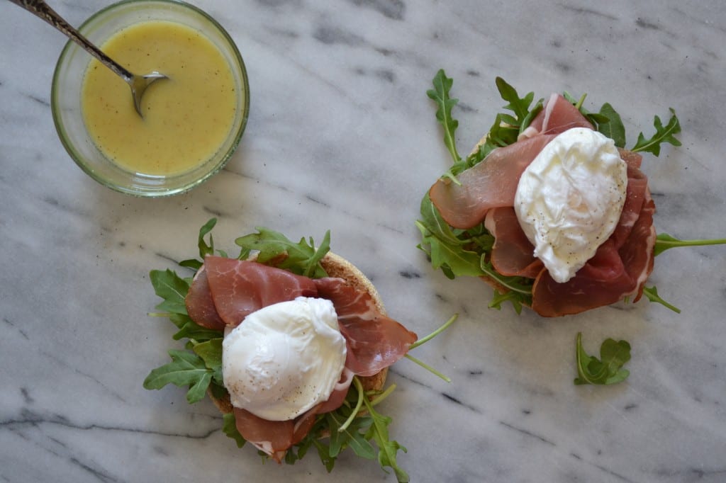 Assemble the sandwiches. Top each half of the English muffin with a bit of arugula, one slice of prosciutto, and a poached egg. Right before serving, top each egg with a teaspoon or two of the vinaigrette.
