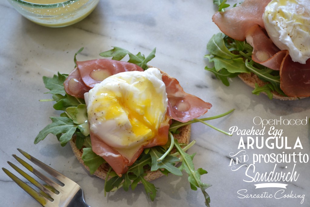Open-Faced Poached Egg, Arugula, and Prosciutto Sandwich with Creamy Lemon Vinaigrette