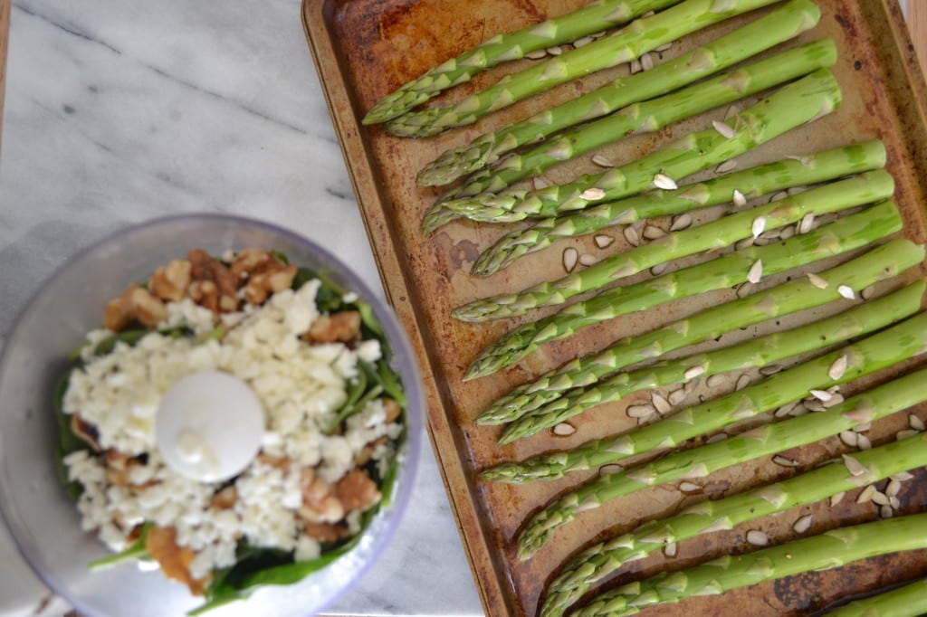 While the asparagus roasts, add the spinach, parsley, walnuts, feta, lemon juice, olive oil, salt, and pepper to a food processor. Puree until smooth.