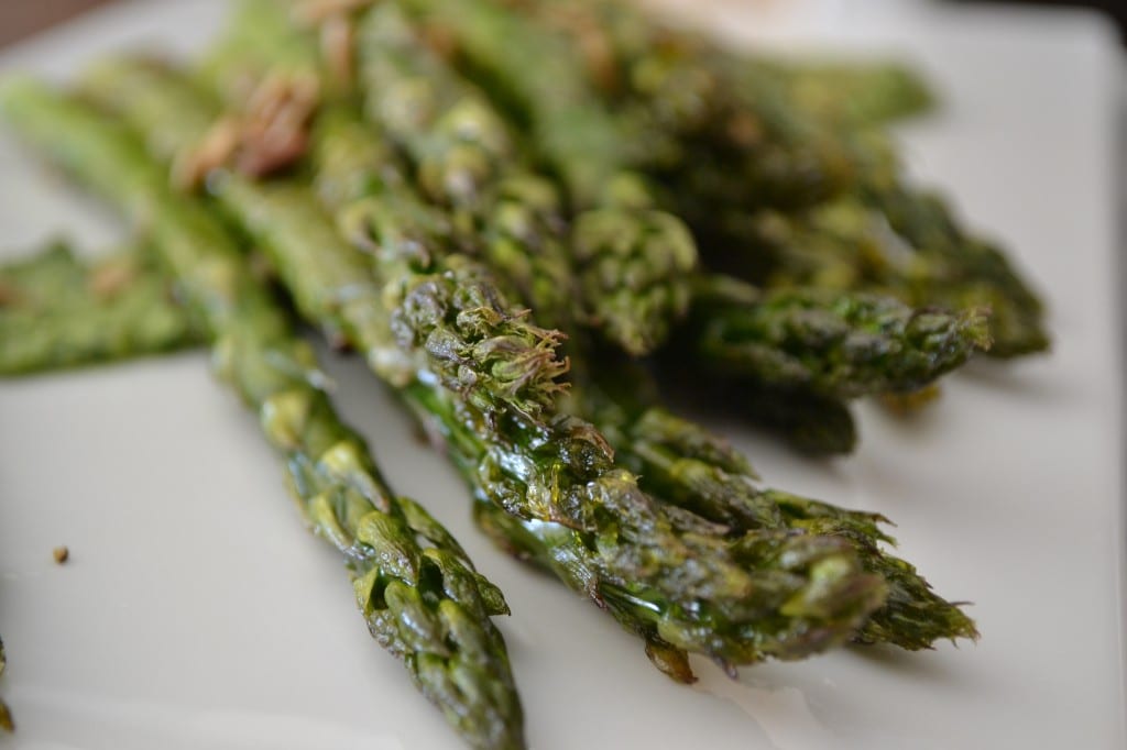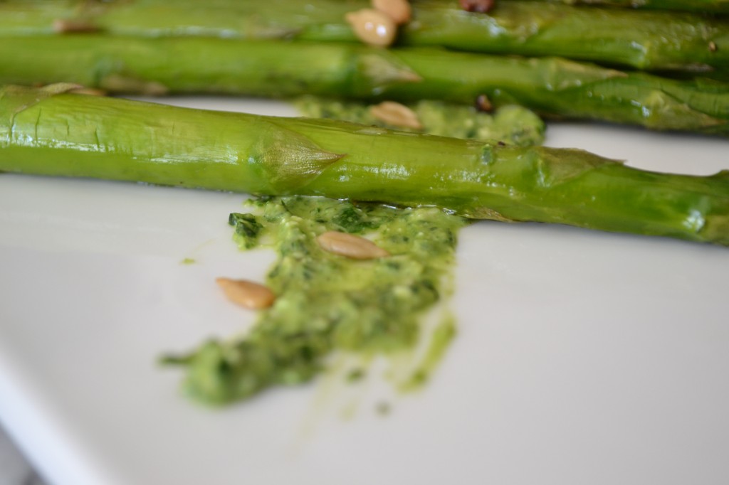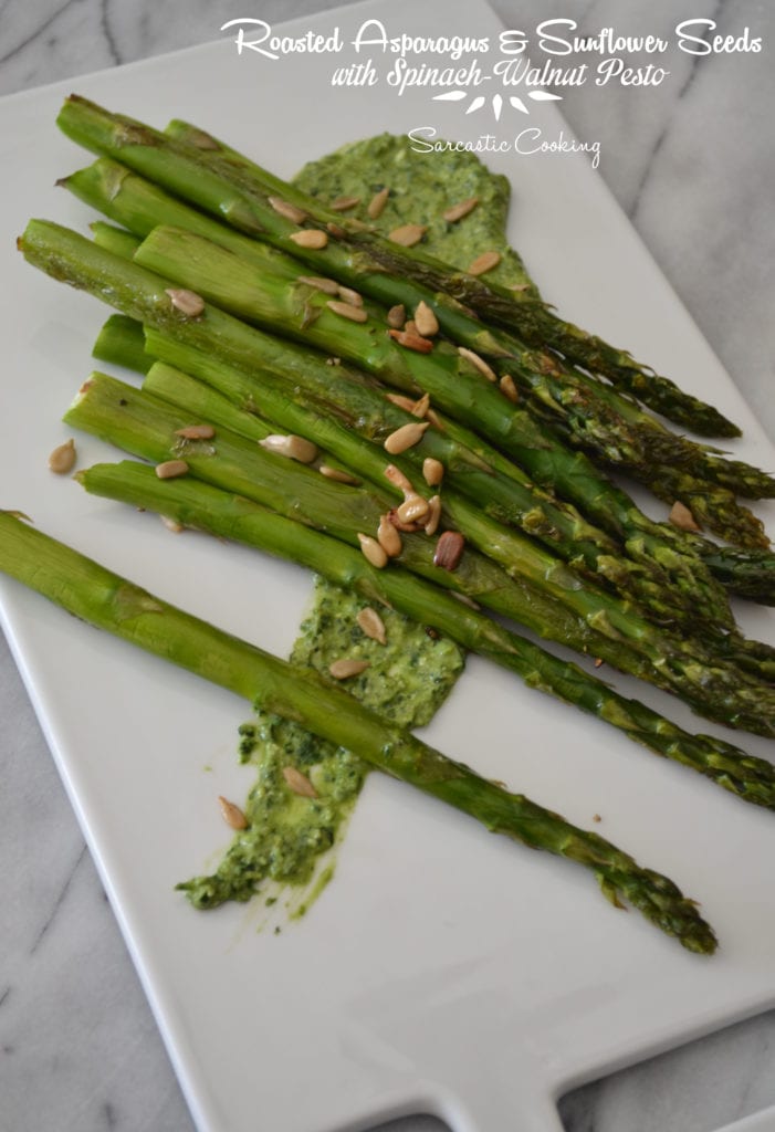 Roasted Asparagus and Sunflower Seeds with Spinach-Walnut Pesto