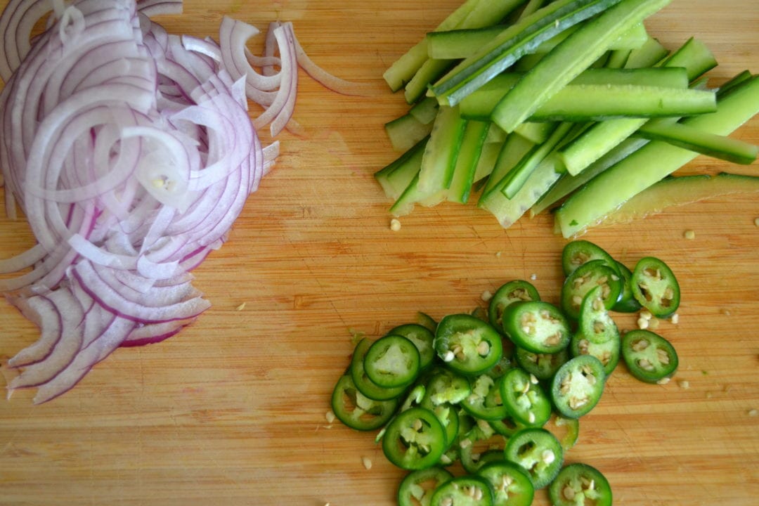 - ½ Large Cucumber seeds removed and then cut into long matchstick-sized pieces