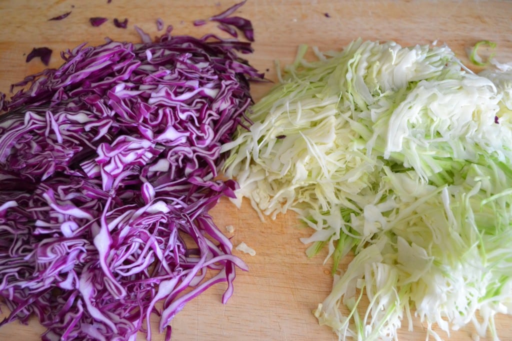 Shred both halves of cabbage using a mandolin on the second thinnest setting. Or use a box grater if you don’t have a mandolin. Add the cabbage to the bowl with the dressing.