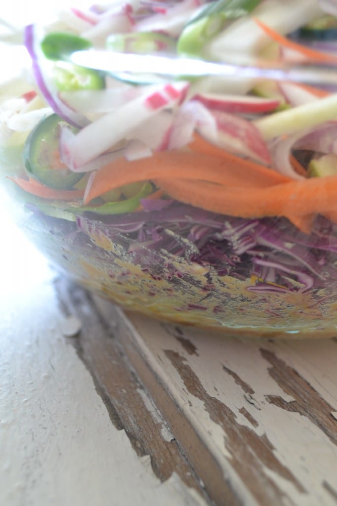 Add the sliced Serrano peppers, green onions, red onions, cucumber, green apple, radishes, jicama, and cilantro to the large bowl. Give it a good mix to make sure the dressing coats all the ingredients.
