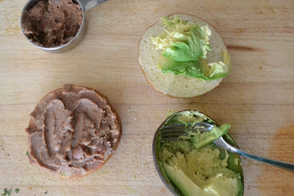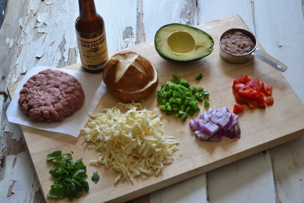 First, set the broiler to high. Mash a spoonful of the refried beans on each bottom bun. Place the buns with the beans on a baking sheet lined with tin foil. Form either two large burger patties or four small burger patties, depending on how hungry you are. Press the burger patties into the beans. Top each patty with a dash of Worcestershire sauce and a sliver of unsalted butter. Set off to the side.