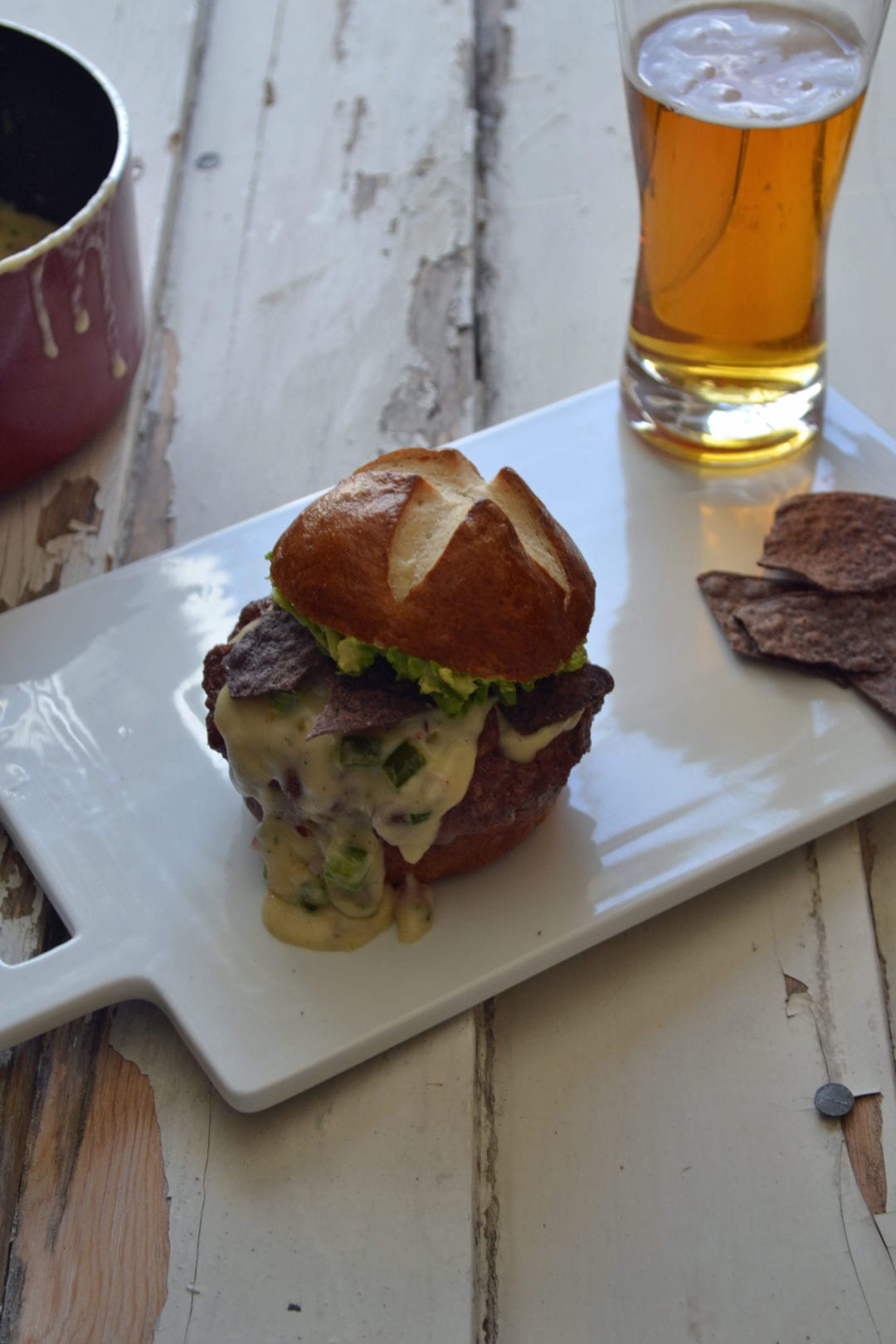 Toast the top buns under the broiler for a minute or two, until slightly golden. Smash some avocado into the top bun. Assemble the burgers by adding some cheese sauce to the top of each beef patty. Top with some crumbled tortilla chips and the top bun and then serve.