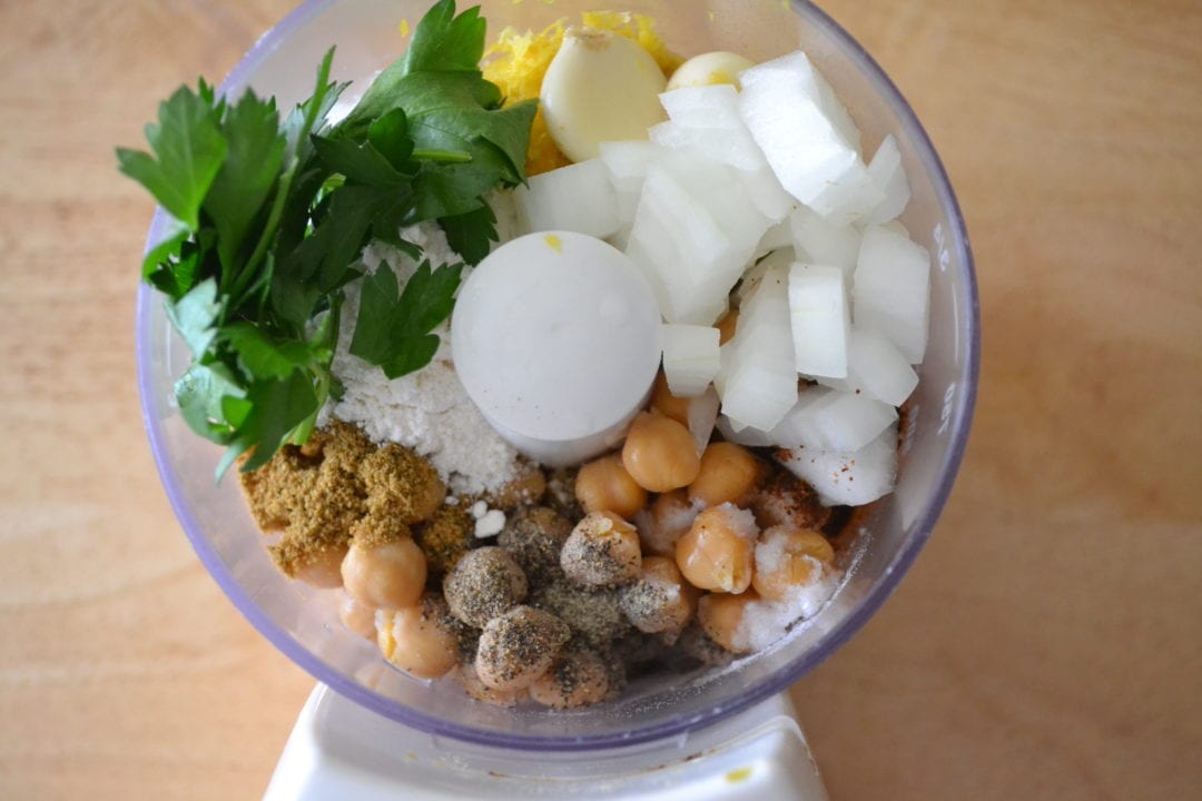 Add chickpeas, flour, garlic, onion, zest, parsley, and spices to a food processor. Puree until almost smooth—you still want to see some chickpeas.