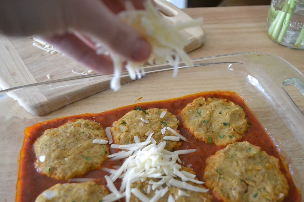Remove the falafels from the dish and place on a plate off to the side. Pour the marinara into the baking dish. Return the falafel to the pan, cover with cheese. Bake for another 2-3 minutes until the cheese melts.