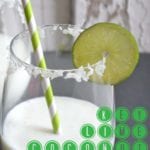 Combine ingredients in a blender. Blend until smooth. Combine a little bit of honey and water on a small plate. Add the shredded coconut to a different small plate. Dip the rim of each glass into the honey and then the coconut. Pour the shake into each glass. Garnish with lime slice.