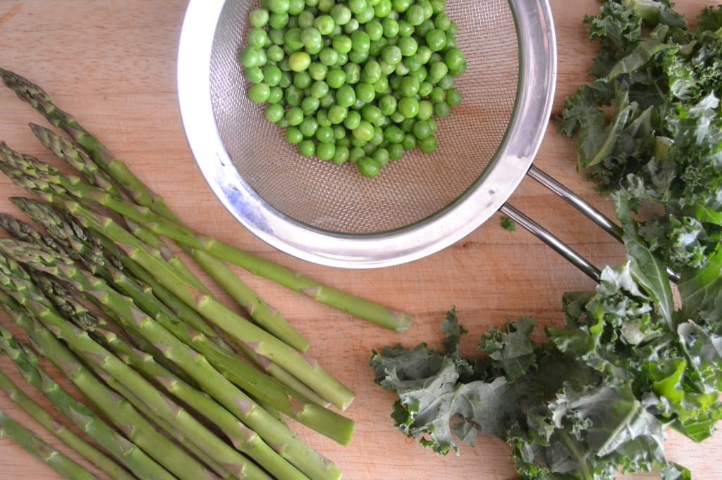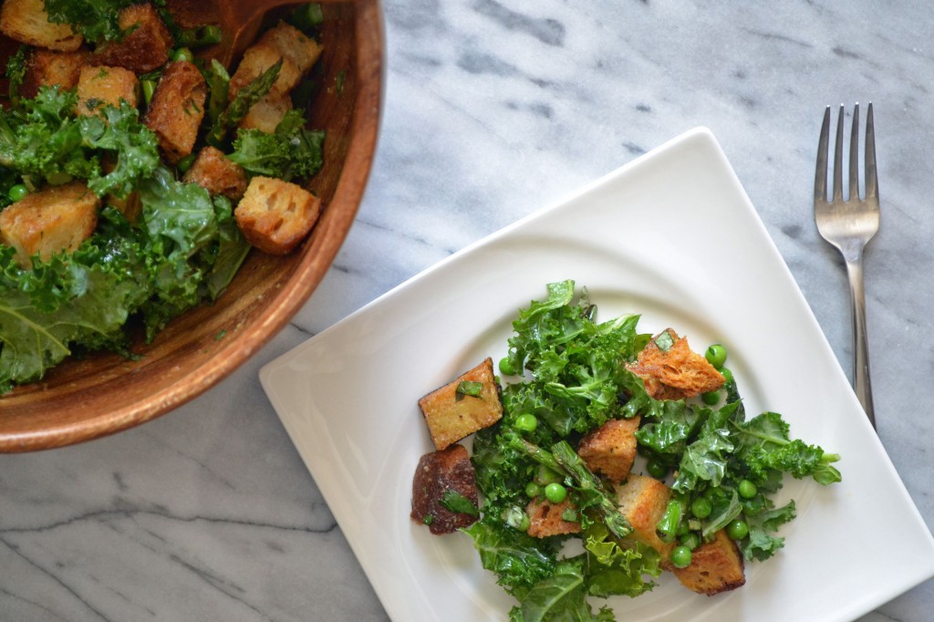 After about five to ten minutes, add the peas, asparagus, kale, parsley, and basil to the bowl. Toss the salad to evenly coat all the ingredients. Serve right away.