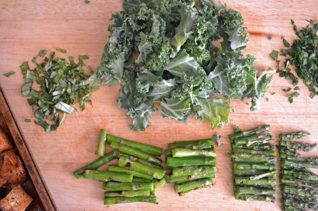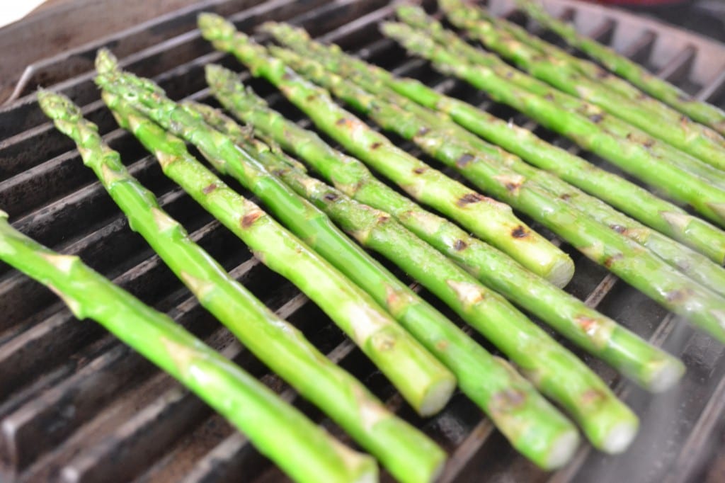Lightly coat the asparagus in a little bit of olive oil and then grill on a grill pan over medium/high heat for four minutes on each side. When grilled through, cut the asparagus into bite-sized pieces.