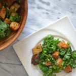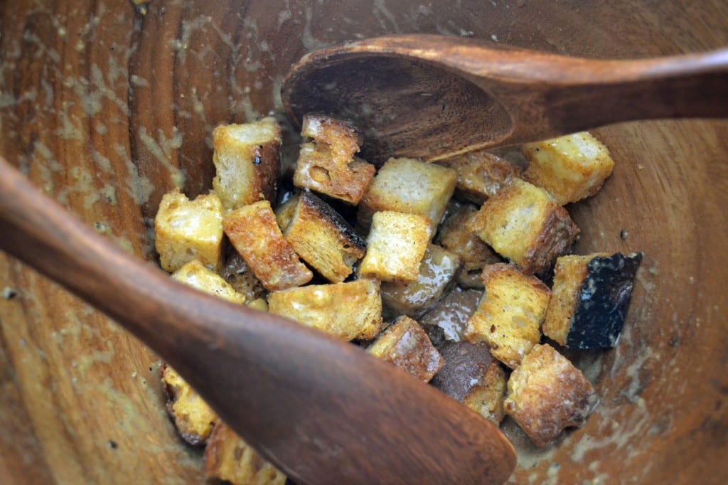 Place the cubed bread on to a small baking sheet. Toss together with olive oil, salt, and pepper. Bake in the oven for about six minutes, toss, and then bake for six more minutes. Let croutons cool on the baking sheet while you make the rest of the salad.