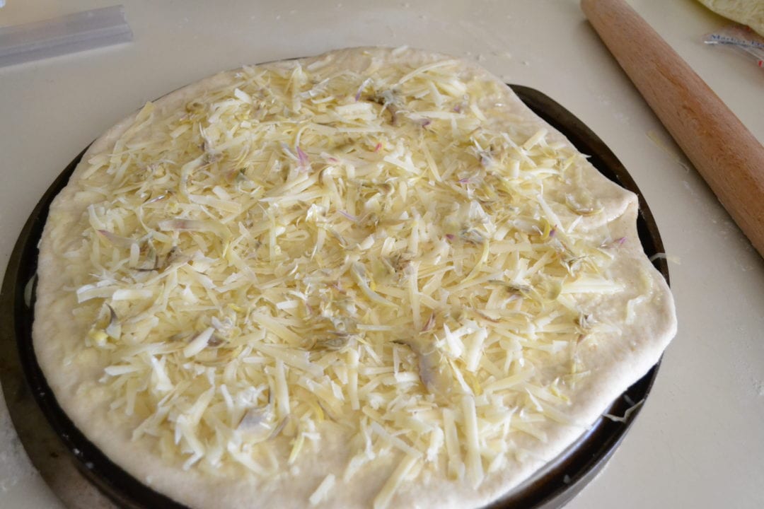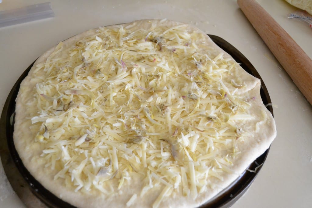 Spread the olive oil and grated garlic all over the top of the dough. Cover the dough with cheese. Sprinkle the artichoke shavings all over the top of the pizza.