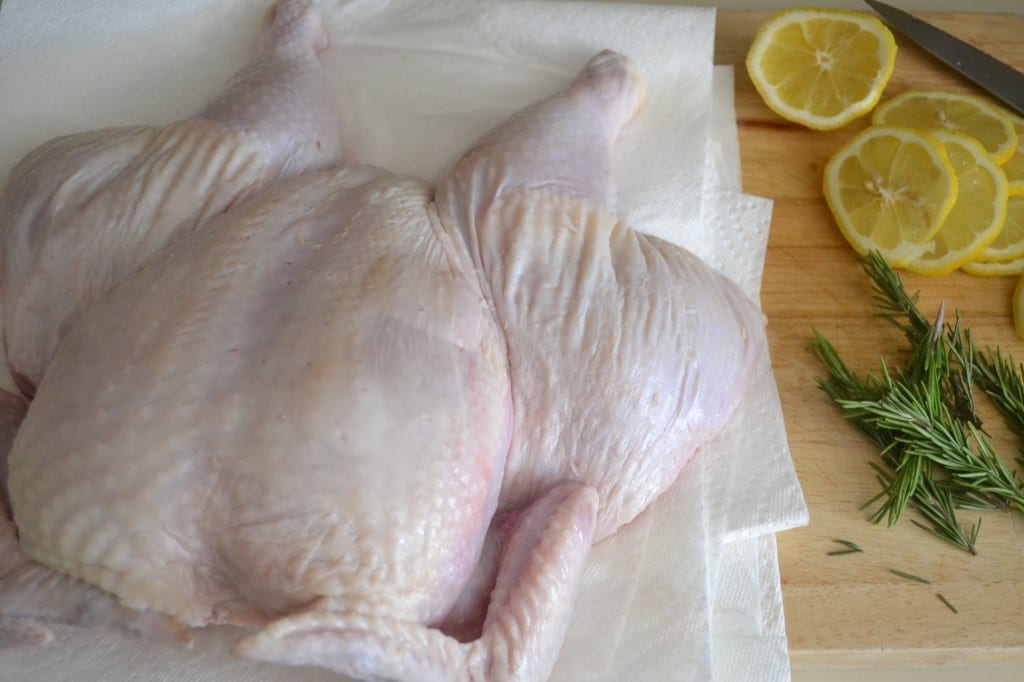 Thinly slice the lemon. Use your fingers to separate the skin from the breast meat and thigh meat. Slide a few lemon slices under the skin along with a half a sprig of rosemary.