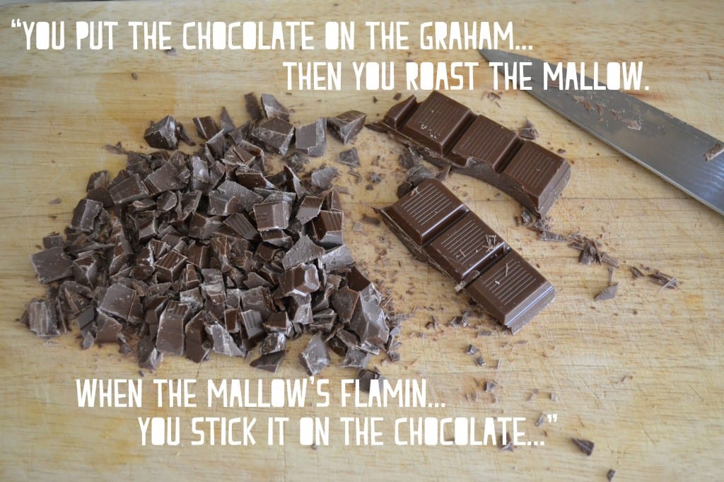 Chop the milk chocolate and graham crackers into small pieces. If you feel like doing some extra work, torch or roast the mini marshmallows over an open flame until they turn golden brown.