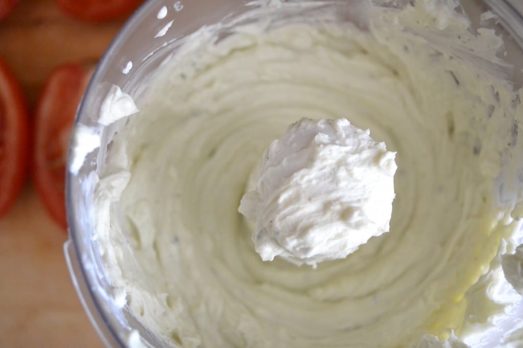 Add the salt, pepper, cream cheese, blue cheese crumbles, and heavy cream to a food processor. Pulse together for a minute or two until the mixture is smooth and creamy.
