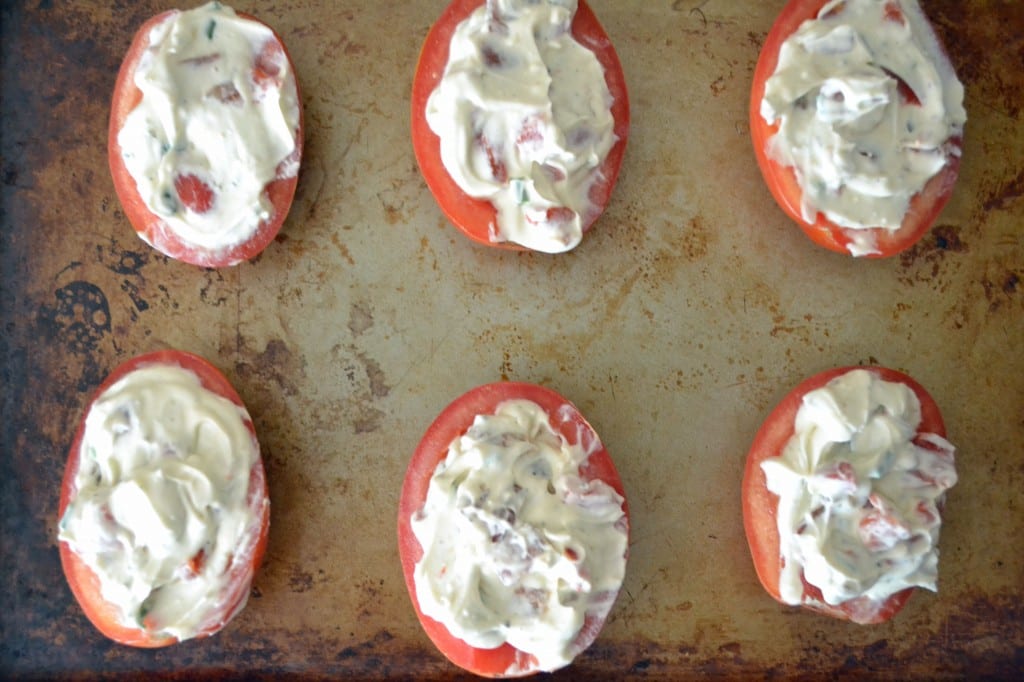 Spoon a few tablespoons of the cream cheese filling into each tomato. Set on a small baking sheet. Turn the broiler on high.
