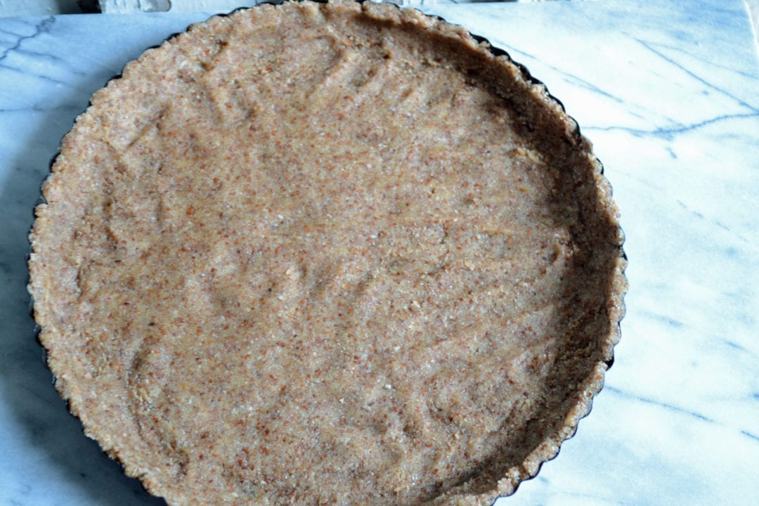 Add crust ingredients to a medium mixing bowl. Mix until all ingredients are moist. Pour the crust mixture into the tart pan. Press into one even layer over the bottom and sides of the tart pan using your hands.
