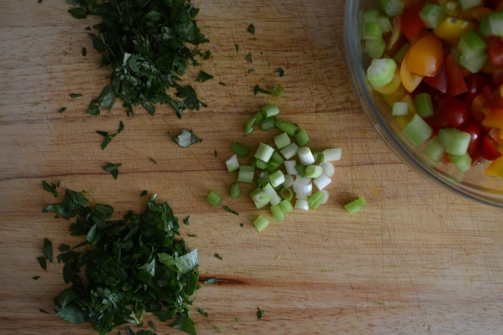 After the ten minutes or so of soaking, drain the liquid from the tomatoes and celery. Add herbs and green onion to the celery and tomatoes. Mix well.