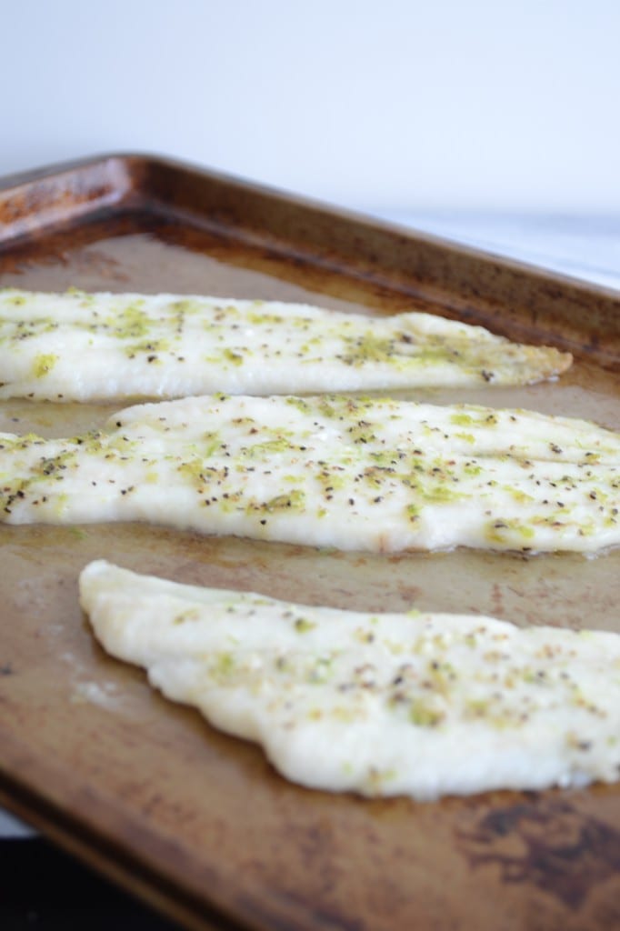 In a small bowl, mix together the olive oil, salt, pepper, and zest. Place fish filets on baking sheet. Rub the olive oil mixture over each side of the fish.