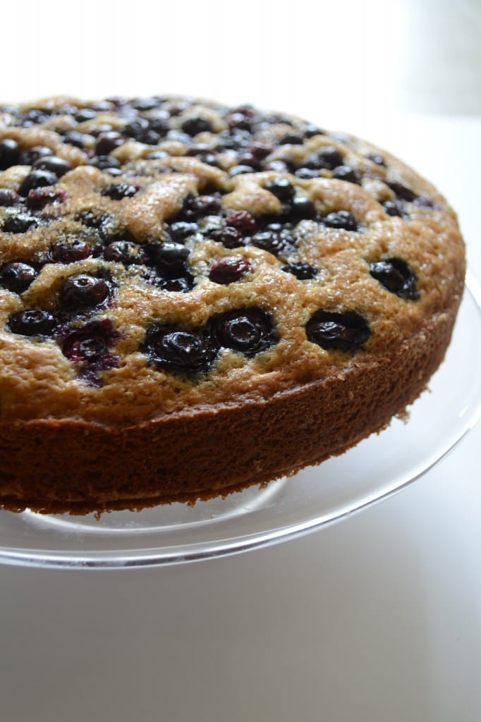 Pour batter into the prepared pan. Smooth out the top. Add the blueberries to the top of the cake and slightly press into the batter. Sprinkle turbinado over the whole top of the cake.