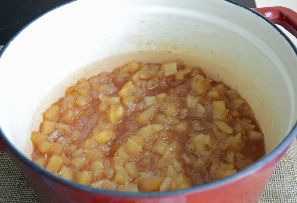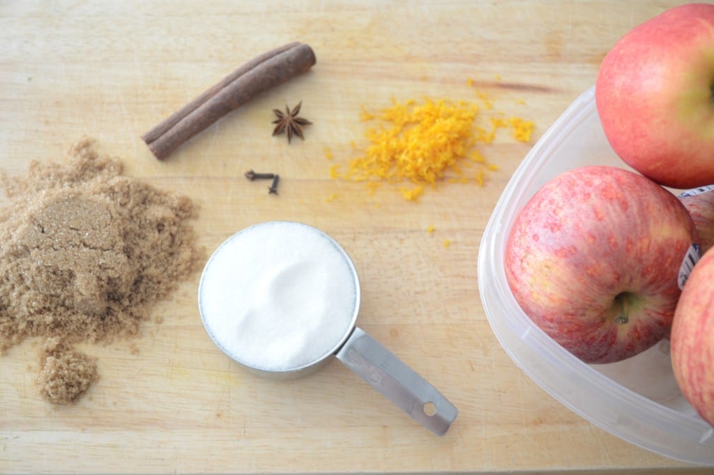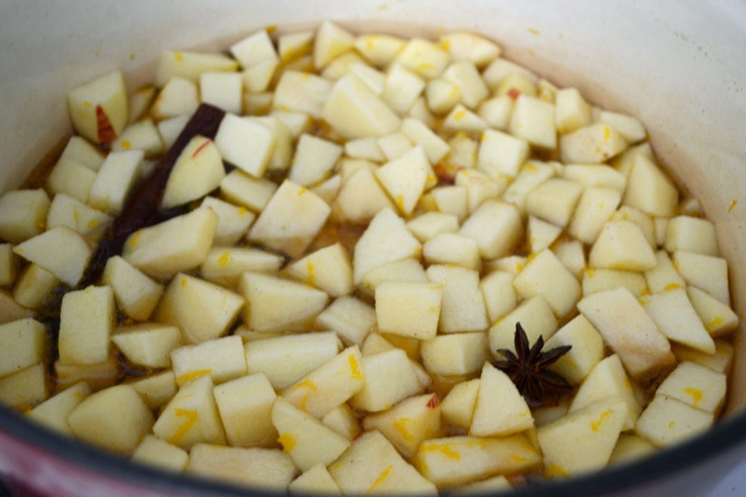 Peel apples, remove core, and then dice. Add apples along with water, sugars, cinnamon stick, cinnamon, star anise, cloves, orange zest, and orange juice to a large heavy-bottomed pot/Dutch oven. Stir to combine.