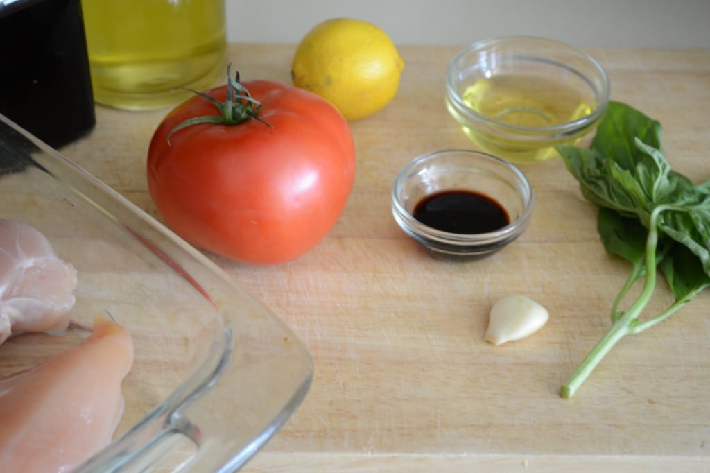 Arrange chicken breasts in a medium baking dish, leave about a ½ an inch between each breast. Drizzle olive oil and balsamic vinegar over the chicken. Use tongs to toss the chicken in the oil and vinegar.