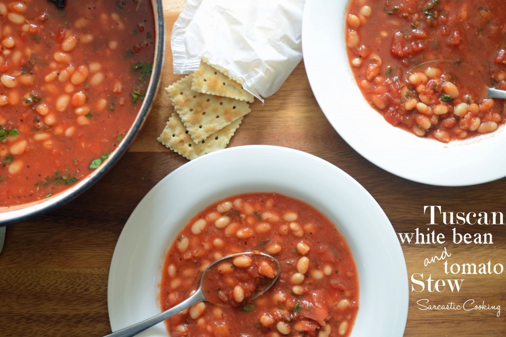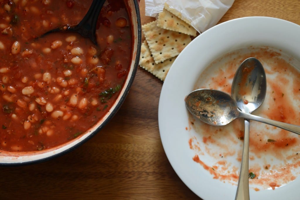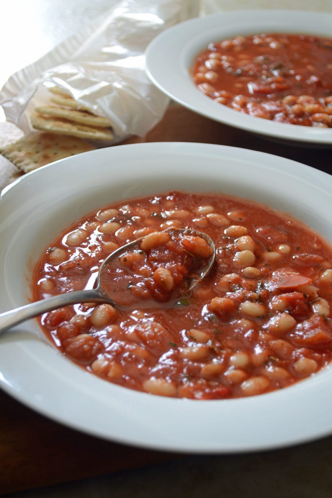 When ready to cook the beans and soup, add the cans of tomatoes to the pot along with the salt, pepper, crushed red pepper flakes, and garlic. Give a stir. Bring the pot to a slow simmer over medium/low heat. Cover with lid. Simmer the soup for an hour.