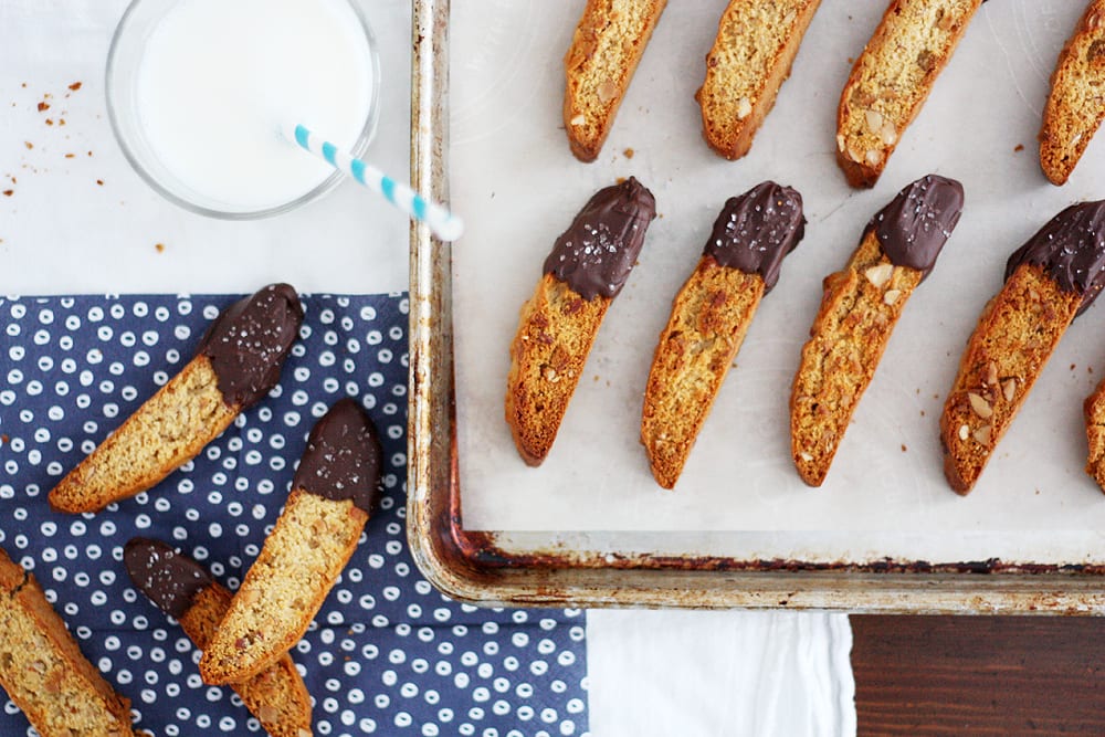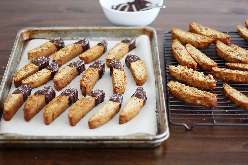 I’ll admit that the process of making biscotti is a bit more involved than the usual scoop-and-dump method for cookies — you have to let the dough chill in the fridge, shape the wet dough into a log and then double-bake it — but that’s what makes biscotti so perfectly crunchy and flavorful. And because I can’t leave well enough alone, I like to dip my biscotti into melty chocolate, just as a bonus. But I don’t think many people would scoff at such a thing.