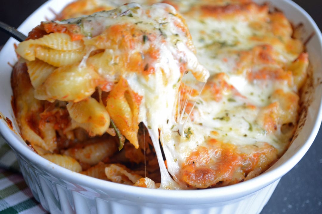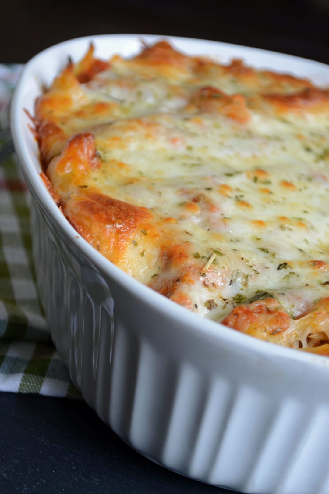 If freezing: Bake pasta as usual and then freeze. To reheat, thaw out pasta morning of and then cover with foil and bake at 350 for 20 minutes until heated through. Frozen pasta will last for a month.