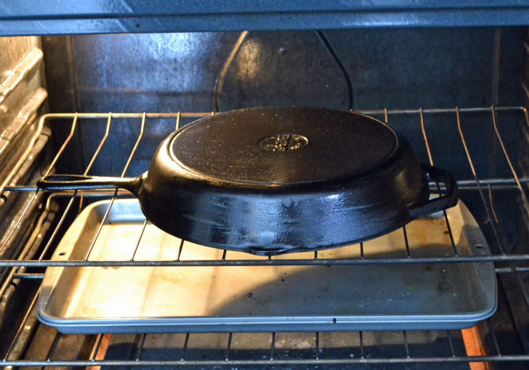 While the oven preheats, rub canola oil or shortening all over the pan. Top, bottom, handle, everywhere. You want just enough oil/shortening to make a thin layer. Place the skillet upside down in the oven and bake for an hour. Carefully remove the skillet and let it cool.