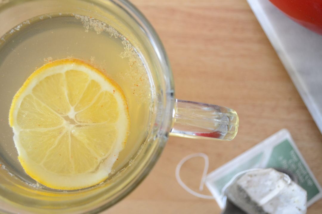 Add the ginger, lemon juice, and cayenne to the mug and stir to combine. Drink while hot.