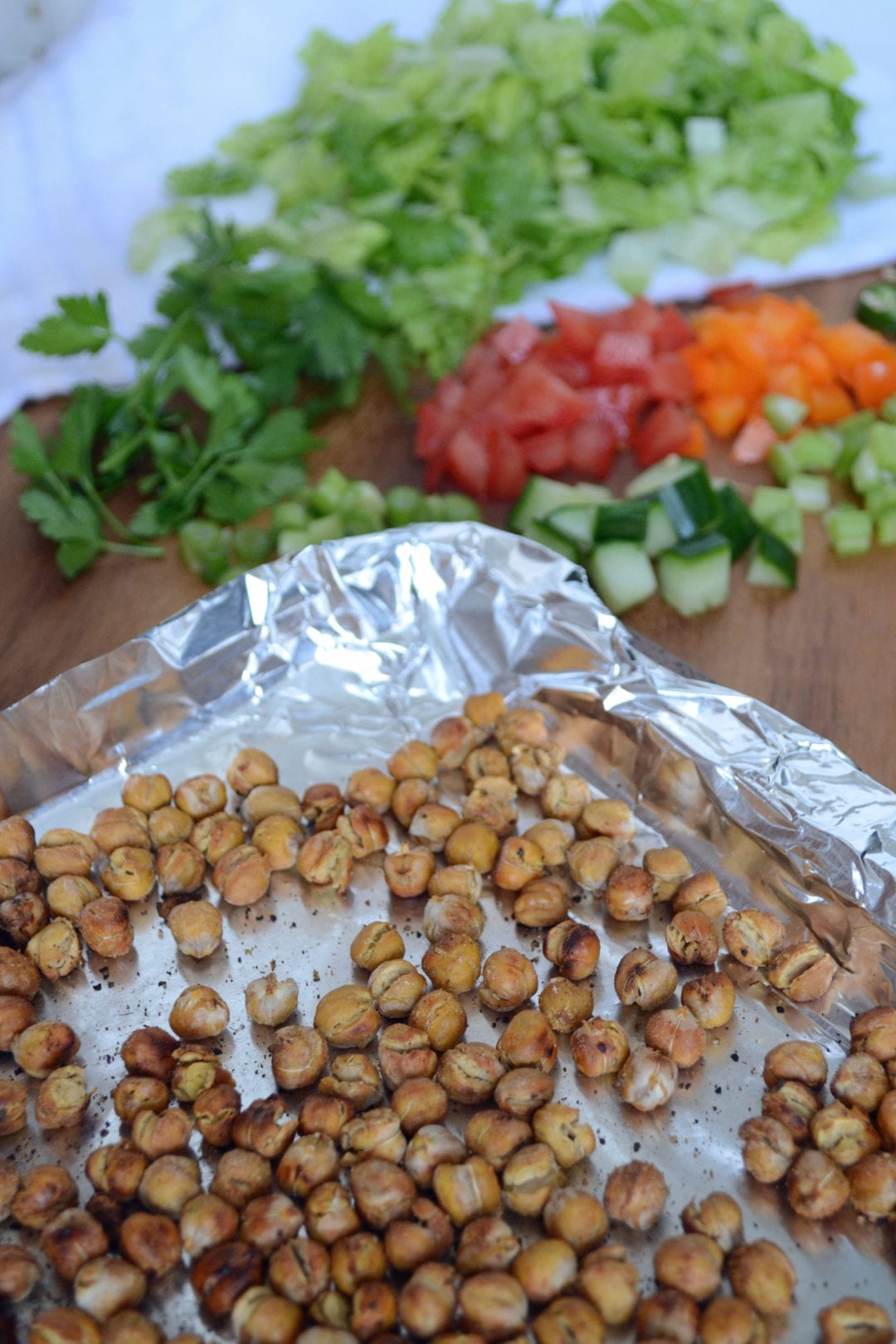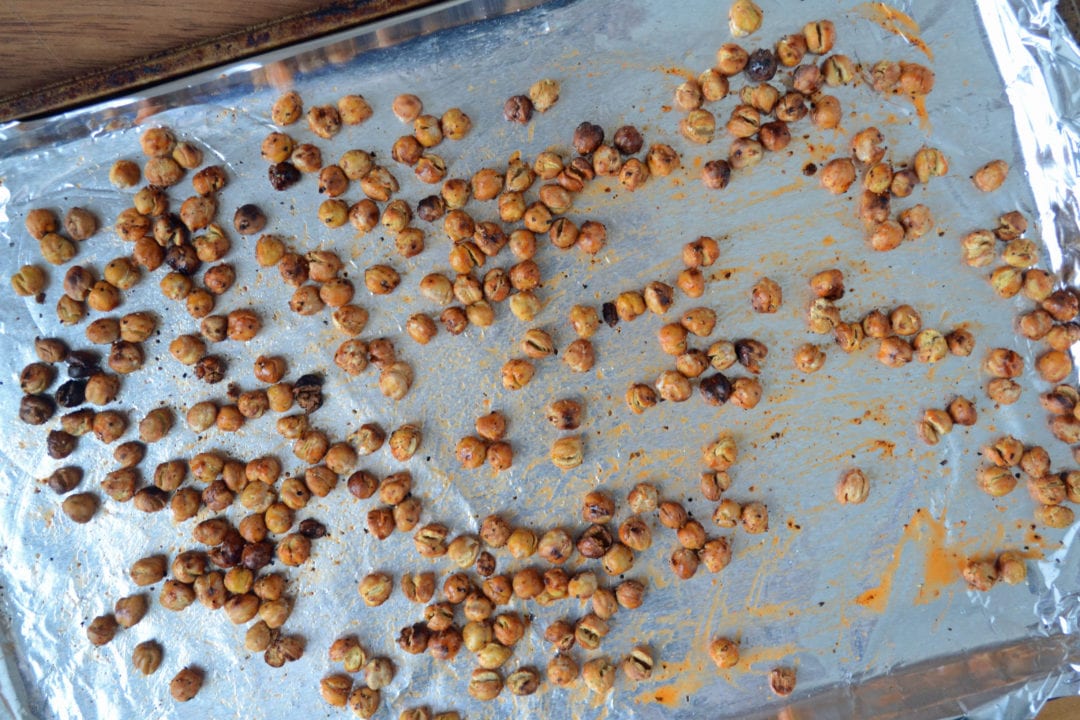 Add dried chickpeas to the foil. Mist with oil and then stir to make sure they are evenly coated. Season and then give the pan a shake so all the chickpeas get some seasoning on them. Bake in the oven for 15 minutes. Remove the pan and flip chickpeas with spatula. Return the pan to the oven for another 10-15 minutes.