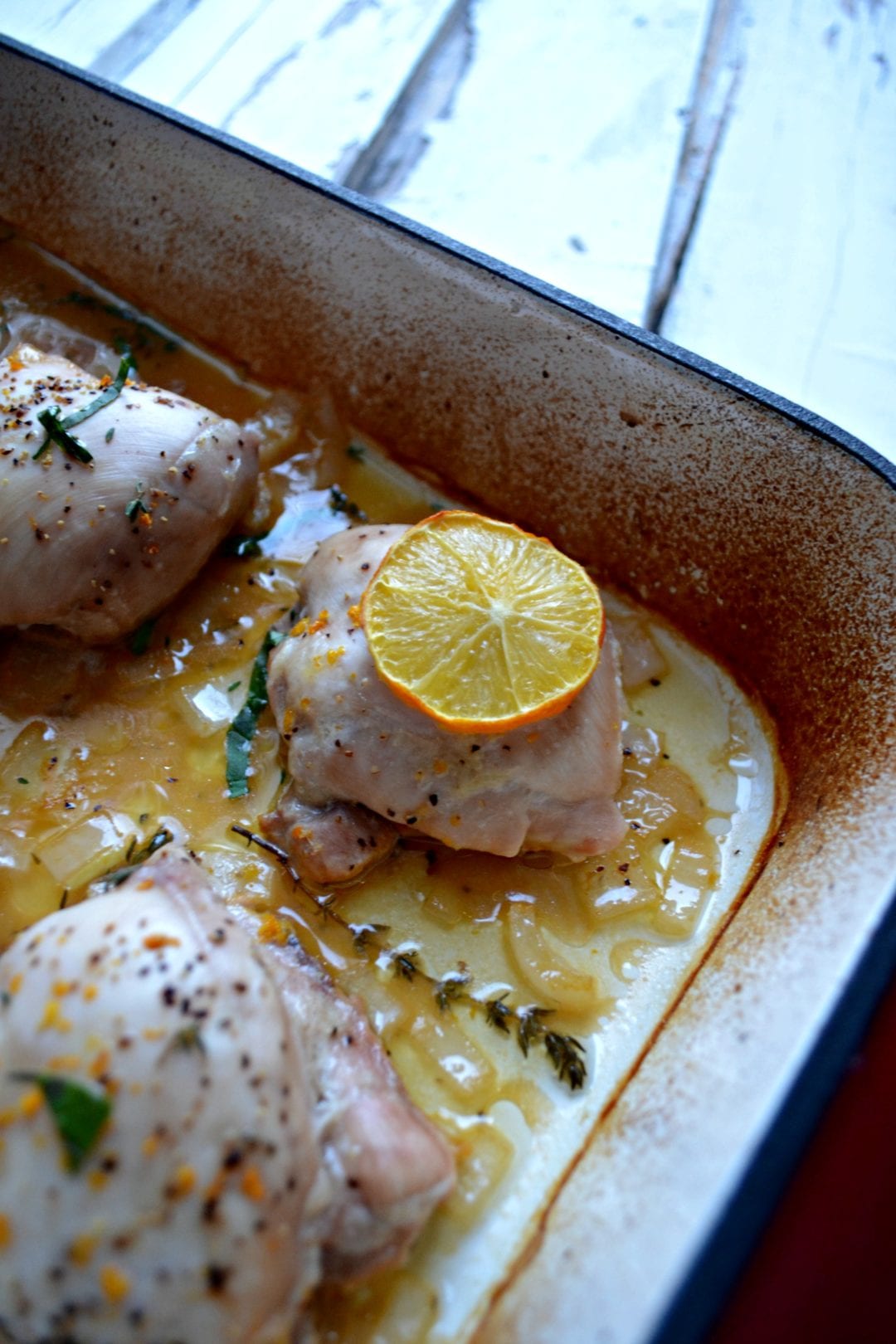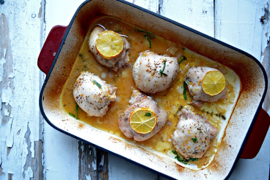 Nestle the chicken thighs down in the sauce. Season the chicken thighs with salt, teaspoon of pepper, and lemon zest. Top three of the thighs with lemon slices.