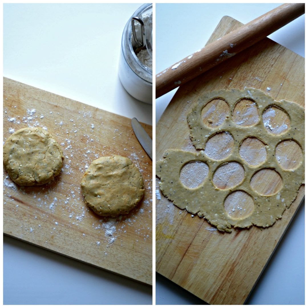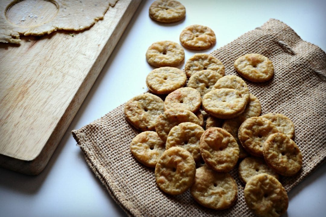 Roll each disc out on a well-floured surface until about 1/8 of an inch thick. Use a 1-inch cookie cutter or shot glass to cut circles out of the dough. Use a toothpick to pierce a hole in the center of each cracker. Place the crackers close together on large baking sheets lined with parchment paper. Bake for 12 – 15 minutes until golden around the edges.