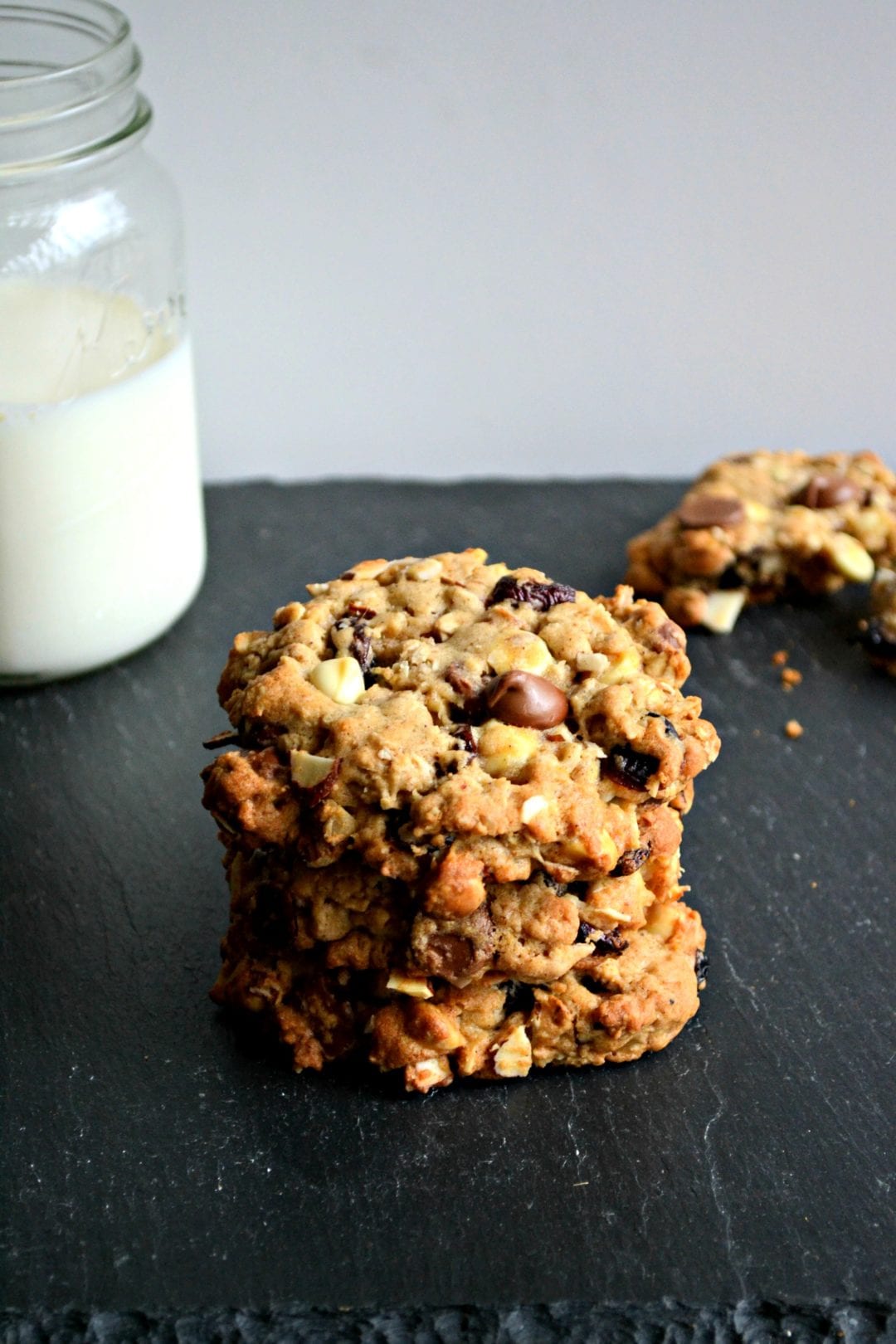 With the mixer on low, add the flour mixture all at once. Mix on low until almost combined. Add in the chocolate chips, white chocolate chips, raisins, cranberries, almonds, and walnuts. Mix on low or with a spatula until combined and no more flour is visible.